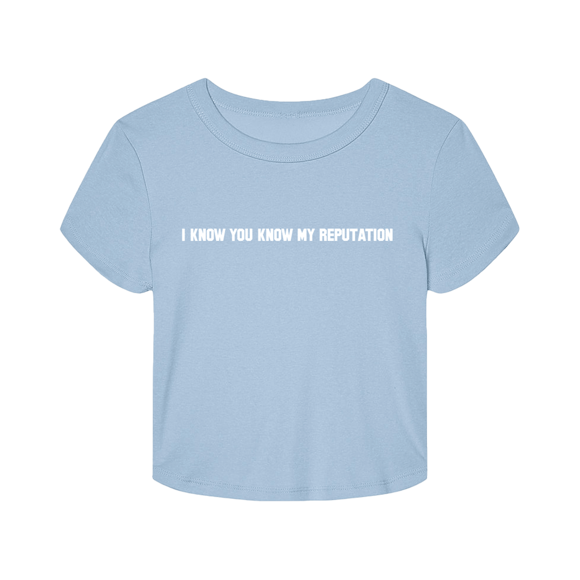 Light blue cropped t-shirt featuring the phrase “I KNOW YOU KNOW MY REPUTATION” printed in white across the chest.